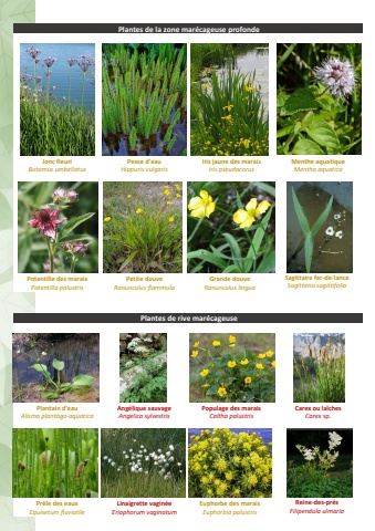Plantes de la zone mar%u00e9cageuse profondeJonc fleuri Butomus umbellatusPesse d%u2019eau Hippuris vulgarisIris jaune des marais Iris pseudacorusMenthe aquatique Mentha aquaticaPotentille des marais Potentilla palustrisPetite douve Ranunculus flammulaGrande douve Ranunculus linguaSagittaire fer-de-lance Sagittaria sagittifoliaPlantes de rive mar%u00e9cageusePlantain d'eau Alisma plantago-aquaticaAng%u00e9lique sauvage Angelica sylvestrisPopulage des marais Caltha palustrisCarex ou la%u00eeches Carex sp.Pr%u00eale des eaux Equisetum fluviatileLinaigrette vagin%u00e9e Eriophorum vaginatumEuphorbe des marais Euphorbia palustrisReine-des-pr%u00e9s Filipendula ulmaria