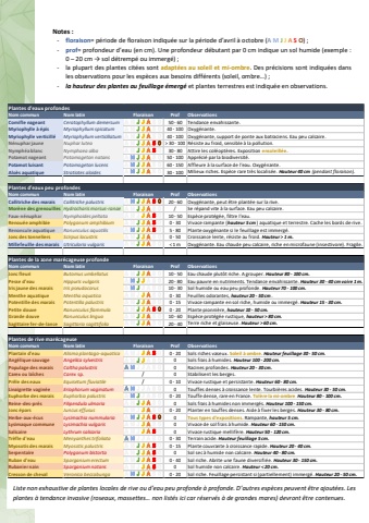 Notes : - floraison= p%u00e9riode de floraison indiqu%u00e9e sur la p%u00e9riode d%u2019avril %u00e0 octobre (A M J J A S O) ; - prof= profondeur d%u2019eau (en cm). Une profondeur d%u00e9butant par 0 cm indique un sol humide (exemple : 0 %u2013 20 cm %u2192 sol d%u00e9tremp%u00e9 ou immerg%u00e9) ; - la plupart des plantes cit%u00e9es sont adapt%u00e9es au soleil et mi-ombre. Des pr%u00e9cisions sont indiqu%u00e9es dans les observations pour les esp%u00e8ces aux besoins diff%u00e9rents (soleil, ombre%u2026) ; - la hauteur des plantes au feuillage %u00e9merg%u00e9 et plantes terrestres est indiqu%u00e9e en observations.Liste non exhaustive de plantes locales de rive ou d%u2019eau peu profonde %u00e0 profonde. D%u2019autres esp%u00e8ces peuvent %u00eatre ajout%u00e9es. Les plantes %u00e0 tendance invasive (roseaux, massettes%u2026 non list%u00e9s ici car r%u00e9serv%u00e9s %u00e0 de grandes mares) devront %u00eatre contenues.Plantes d'eaux profondesNom commun Nom latin Floraison Prof ObservationsCornifle nageant Ceratophyllum demersum A M J J A S O 50 - 60 Tendance envahissante.Myriophylle %u00e0 %u00e9pis Myriophyllum spicatum A M J J A S O 40 - 100 Oxyg%u00e9nante.Myriophylle verticill%u00e9 Myriophyllum verticillatum A M J J A S O 40 - 100 Oxyg%u00e9nante, support de ponte aux batraciens. Eau peu calcaire.N%u00e9nuphar jaune Nuphar lutea A M J J A S O > 30 - 100 R%u00e9siste au froid, sensible %u00e0 la pollution.Nymph%u00e9a blanc Nymphaea alba A M J J A S O 30 - 80 Attire les col%u00e9opt%u00e8res. Exposition ensoleill%u00e9e.Potamot nageant Potamogeton natans A M J J A S O 50 - 100 Appr%u00e9ci%u00e9 par la biodiversit%u00e9.Potamot luisant Potamogeton lucens A M J J A S O 60 - 150 Affleure %u00e0 la surface de l'eau. Oxyg%u00e9nante.Alo%u00e8s aquatique Stratiotes aloides A M J J A S O 30 - 100 Milieux riches. Esp%u00e8ce rare tr%u00e8s localis%u00e9e. Hauteur 40 cm (pendant floraison).Plantes d'eaux peu profondesNom commun Nom latin Floraison Prof ObservationsCallitriche des marais Callitriche palustris A M J J A S O 20 - 60 Oxyg%u00e9nante, peut %u00eatre plant%u00e9e sur la rive. Mor%u00e8ne des grenouilles Hydrocharis morsus-ranae A M J J A S O / Se r%u00e9pand vite %u00e0 la surface. Eau peu calcaire.Faux-n%u00e9nuphar Nymphoides peltata A M J J A S O 10 - 50 Esp%u00e8ce prot%u00e9g%u00e9e, filtre l'eau.Renou%u00e9e amphibie Polygonum amphibium A M J J A S O 0 - 30 Vivace rampante (hauteur 5 cm ) aquatique et terrestre. Cache les bords de rive.Renoncule aquatique Ranunculus aquatilis A M J J A S O 5 - 80 Plante oxyg%u00e9nante si le feuillage est immerg%u00e9.Jonc des tonneliers Scirpus lacustris A M J J A S O 0 - 50 Croissance lente, r%u00e9siste au froid. Hauteur > 1 m.Millefeuille des marais Utricularia vulgaris A M J J A S O < 1 m Oxyg%u00e9nante. Eau chaude peu calcaire, riche en microfaune (insectivore). Fragile.Plantes de la zone mar%u00e9cageuse profondeNom commun Nom latin Floraison Prof ObservationsJonc fleuri Butomus umbellatus A M J J A S O 10 - 50 Eau chaude plut%u00f4t riche. A grouper. Hauteur 80 - 100 cm.Pesse d'eau Hippuris vulgaris A M J J A S O 20 - 80 Eau pauvre en nutriments. Tendance envahissante. Hauteur 30 - 40 cm voire 1 m.Iris jaune des marais Iris pseudacorus A M J J A S O 10 - 30 Sol humide ou eau peu profonde. Hauteur 70 - 100 cm.Menthe aquatique Mentha aquatica A M J J A S O 0 - 30 Feuilles odorantes, hauteur 20 - 50 cm .Potentille des marais Potentilla palustris A M J J A S O 0 - 15 Vivace rampante en sol riche, humide ou immerg%u00e9. Hauteur 15 - 30 cm.Petite douve Ranunculus flammula A M J J A S O 0 - 20 Plante pionni%u00e8re, hauteur 10 - 50 cm.Grande douve Ranunculus lingua A M J J A S O 10 - 60 Esp%u00e8ce prot%u00e9g%u00e9e rustique, hauteur > 80 cm.Sagittaire fer-de-lance Sagittaria sagittifolia A M J J A S O 20 - 40 Terre riche et glaiseuse. Hauteur > 60 cm.Plantes de rive mar%u00e9cageuseNom commun Nom latin Floraison Prof ObservationsPlantain d'eau Alisma plantago-aquatica A M J J A S O 0 - 20 Sols riches vaseux. Soleil %u00e0 ombre. Hauteur feuillage 30 - 50 cm.Ang%u00e9lique sauvage Angelica sylvestris A M J J A S O 0 Sols frais %u00e0 humides. Hauteur 100 - 200 cm.Populage des marais Caltha palustris A M J J A S O 0 Racines profondes. Hauteur 20 - 30 cm.Carex ou la%u00eeches Carex sp. / 0 Stabilisent les berges.Pr%u00eale des eaux Equisetum fluviatile / 0 - 10 Vivace rustique et persistante. Hauteur 60 - 80 cm.Linaigrette vagin%u00e9e Eriophorum vaginatum A M J J A S O 0 Touffes denses %u00e0 croissance lente. Tourbi%u00e8res acides. Hauteur 30 - 50 cm.Euphorbe des marais Euphorbia palustris A M J J A S O 0 - 20 Touffe dense, rare en France. Tol%u00e8re la mi-ombre. Hauteur 80 - 100 cm.Reine-des-pr%u00e9s Filipendula ulmaria A M J J A S O 0 Sols frais %u00e0 humides non immerg%u00e9s. Hauteur 100 - 150 cm.Jonc %u00e9pars Juncus effusus A M J J A S O 0 - 20 Planter en touffes denses. Aide %u00e0 fixer les berges. Hauteur 30 - 80 cm.Herbe-aux-%u00e9cus Lysimachia nummularia A M J J A S O 0 Tous types d'expositions. Rampante, hauteur 5 cm.Lysimaque commune Lysimachia vulgaris A M J J A S O 0 Vivace de sol frais %u00e0 humide. Hauteur 60 - 150 cm.Salicaire Lythrum salicaria A M J J A S O 0 Vivace rustique mellif%u00e8re. Hauteur 50 - 120 cm.Tr%u00e8fle d'eau Menyanthes trifoliata A M J J A S O 0 - 30 Terrain acide. Hauteur feuillage 5 cm.Myosotis des marais Myosotis palustris A M J J A S O 0 - 15 Plante couvrante %u00e0 croissance rapide. Hauteur 20 - 40 cm.Serpentaire Polygonum bistorta A M J J A S O 0 Sol sec %u00e0 humide non calcaire. Hauteur 40 - 80 cm.Ruban d'eau Sparganium erectum A M J J A S O 0 - 40 Sol riche. Abrite une faune diversifi%u00e9e. Hauteur 30 - 150 cm.Rubanier nain Sparganium natans A M J J A S O 0 Sol humide non calcaire. Hauteur < 20 cm.Cresson de cheval Veronica beccabunga A M J J A S O 0 - 20 Sol riche. Feuillage persistant si (partiellement) immerg%u00e9. Hauteur 20 - 50 cm.
